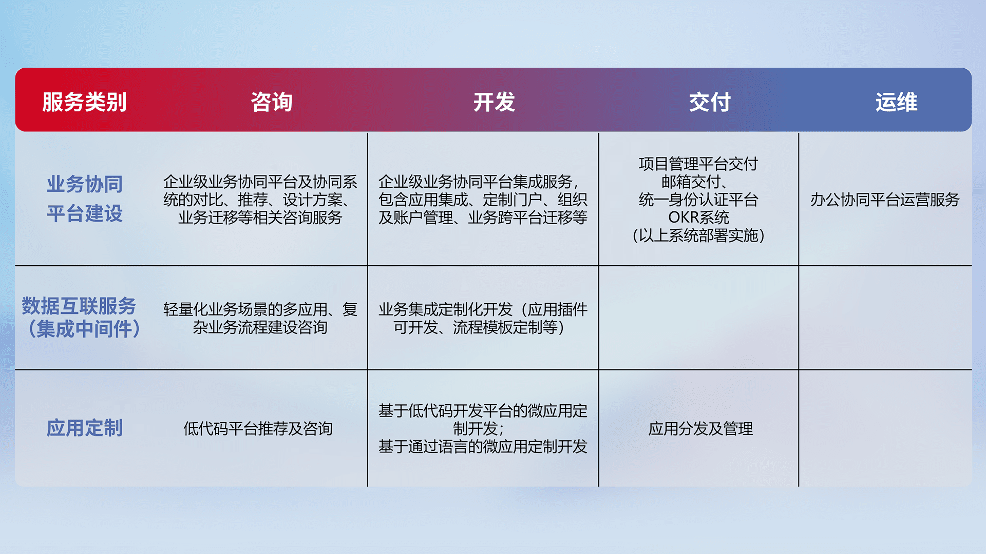 针对钉钉、、、、企微、、IDaas等平台级产品提供产品的规划、、方案、、、、交付、、定制化开发等服务,,实现如统一协同办公、、、智能客户服务、、、、混合会议管理、、、智能数据查询、、等业务场景,,,,实现数字化转型。。。。